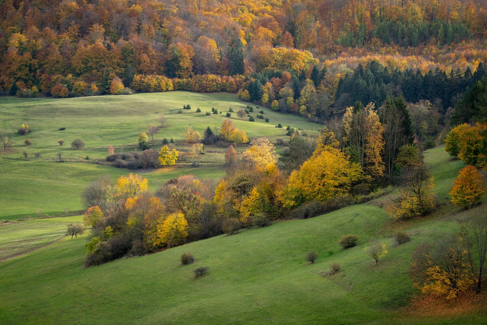 This autumn, I explored the German Mittelgebirge, specifically the Harz, Rhön, Spessart, and Hainich National Park in Thuringia. My photographic focus was on the beech forests, where the season painted the landscape in soft hues of orange, yellow, and hints of green.